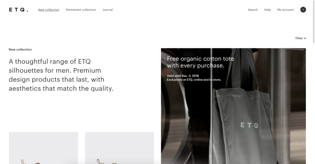 มาถึงเว็บไซต์แนว e-commerce กันบ้างกับ ETQ ด้วยการออกแบบที่บอกเล่าสินค้าผ่านทางรูปภาพได้ดี มีการจัดวางสินค้าที่เรียบร้อย เน้นใช้ภาพสินค้าบนพื้นหลังสีเทา ทำให้เว็บไซต์สามารถคุมโทนของสินค้าและงานออกแบบได้เป็นอย่างดี การออกแบบเว็บไซต์จะเน้นที่พื้นหลังสีขาวและข้อความสีดำ มีการจัดวางองค์ประกอบที่ลงตัวเป็นระเบียบ