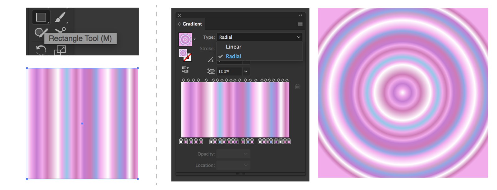 สามารถเปลี่ยนทิศทางของสีได้ด้วยการเปลี่ยน type ที่ Gradient Panel เลือกได้ทั้ง Linear และ Radial แล้วแต่ความต้องการ