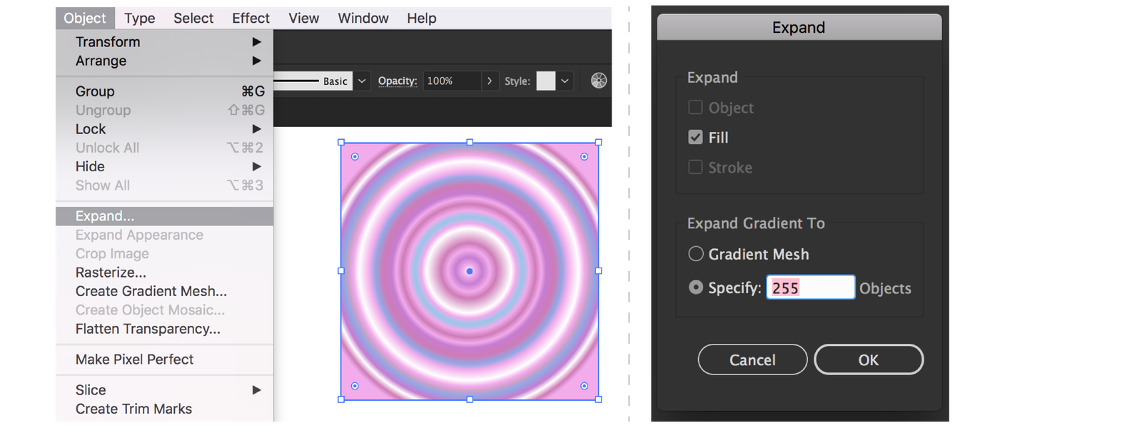 Select ชิ้นงานไว้และกดคำสั่ง Object > Expand