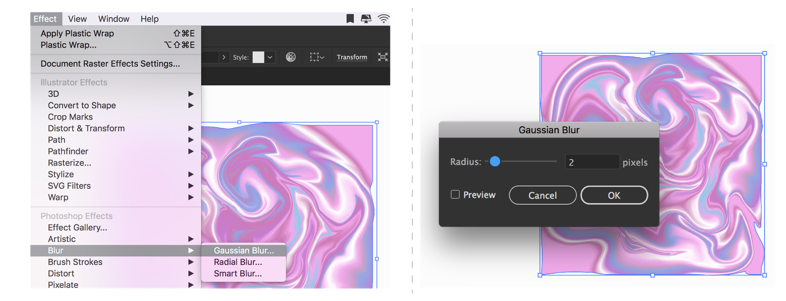 Select ชิ้นงานและกดคำสั่ง Effect > Blur > Gaussian Blur