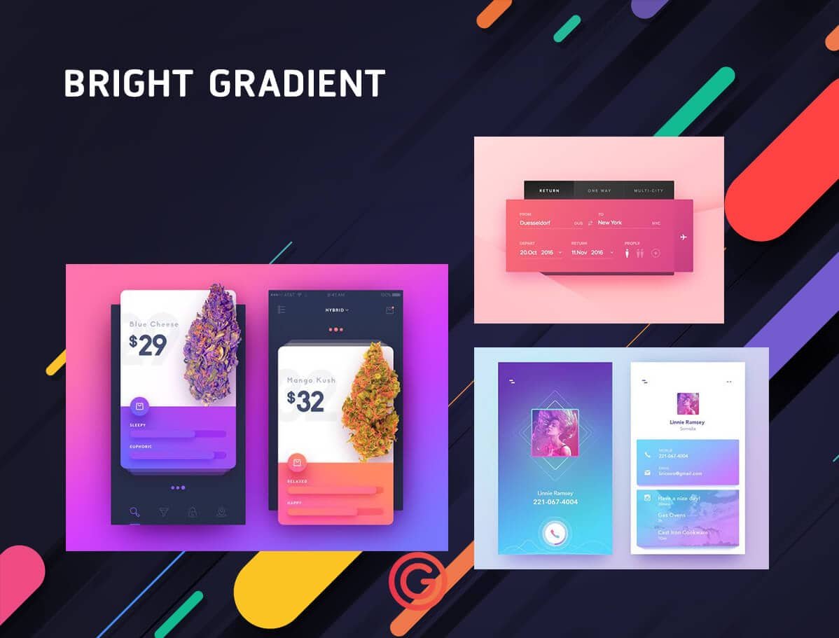 ในยุคของ Flat Design เฟื่องฟูการใช้สีพื้นๆ ก็ทำให้งานดูจืดได้ นักออกแบบจึงใช้ gradient เข้ามาเป็นตัวช่วยในงานออกแบบไม่ให้งานจืดจนเกินไป แต่สำหรับปีหน้าโทนสีที่เป็น Bright gradient จึงได้รับการคาดการณ์ว่าจะได้รับความนิยมในงานออกแบบ 2018 มากขึ้น