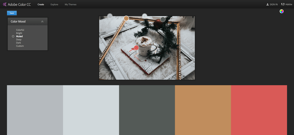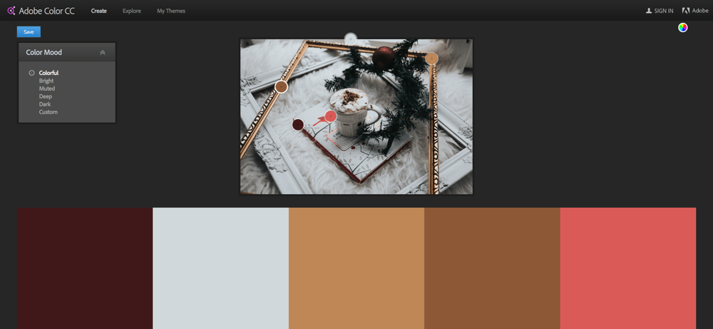 ในการสร้างชุดสีจะมี Color Mood ต่างๆให้เลือกอยู่ทางขวามือเราสามารถเลือก Mood อื่นๆได้เช่น ชุดสีโทนสว่าง, โทนมืด ระบบของเว็บไซต์ก็จะทำการเลือกชุดสีใหม่ให้อัตโนมัติ
